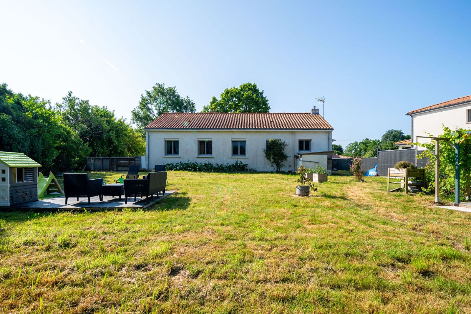 COURGEON IMMOBILIER - SAINT PHILBERT DE GRAND LIEU - À 6 kms du bourg, avec accès rapide sur la route de NANTES, venez découvrir cette belle maison de plain-pied sur 2205m² de terrain, offrant une belle pièce de vie orientée SUD avec une cuisine aménagée, une arrière cuisine, 4 chambres, et une salle de bains + douche. Les plus : poêle à granules, électricité, plomberie et micro-station récentes. UNE VISITE S'IMPOSE!!! (4.91 % d'honoraires TTC à la charge de l'acquéreur.)